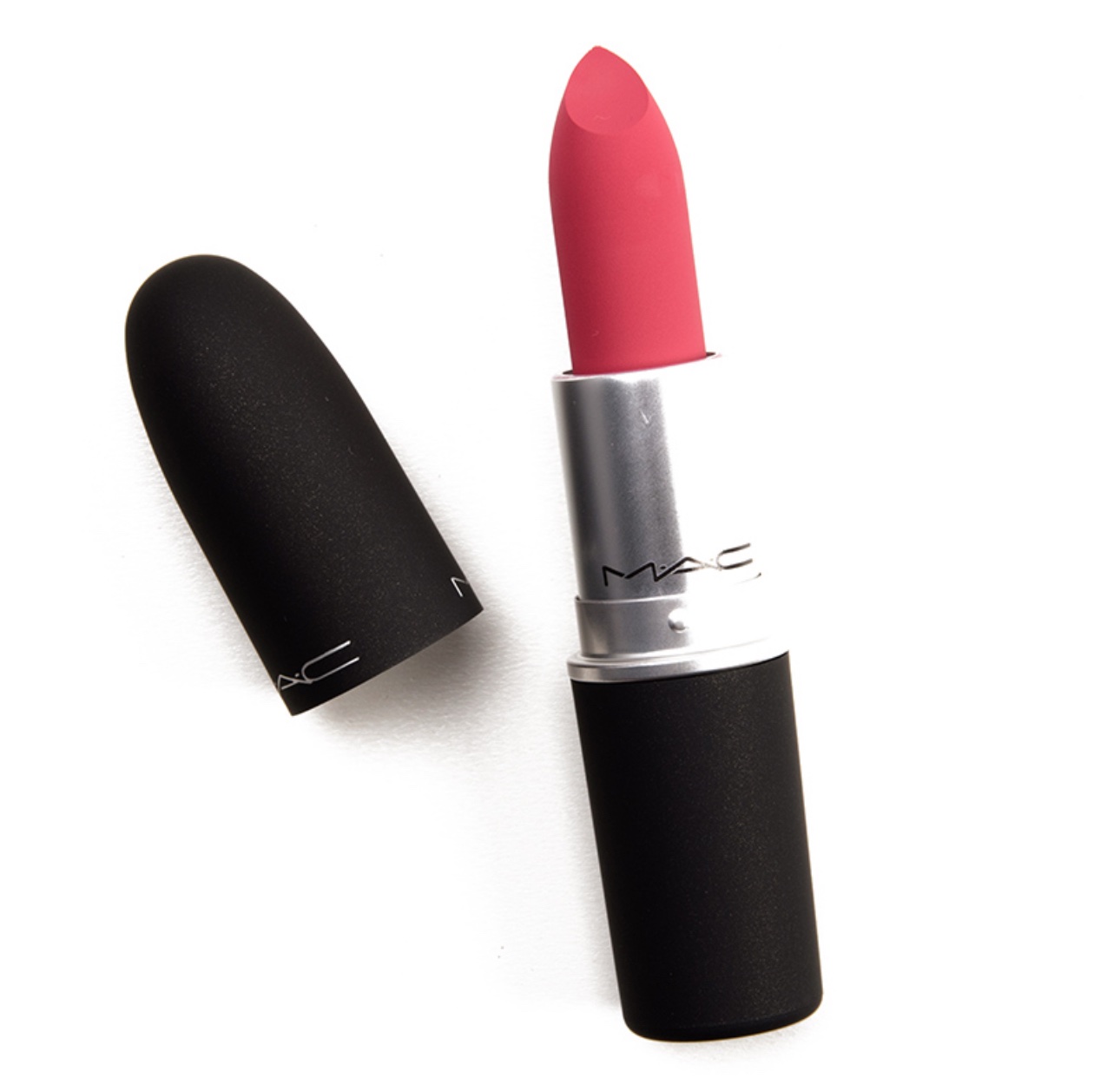 MAC Powder kiss – A Little Tamed is a moderately warm-toned, dark coral with a satin finish. It is a permanent lipstick